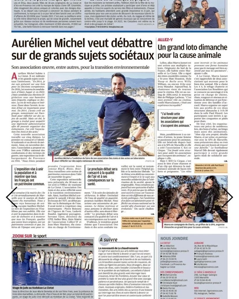 La Provence présente Aurélien Michel et son association Des Amis et des Actes, décrite comme un laboratoire pour réfléchir sur les grands sujets nationaux de société : environnement, santé, identité nationale et devoir de mémoire.