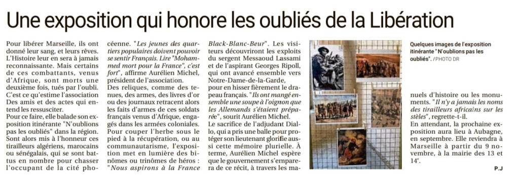 La Provence a consacrĂ© un grand article Ă l’exposition itinĂ©rante « N’oublions pas nos oubliĂ©s », mettant en lumière le combat des tirailleurs algĂ©riens, marocains et sĂ©nĂ©galais pour la libĂ©ration de Marseille, et le travail de mĂ©moire portĂ© par l’association.