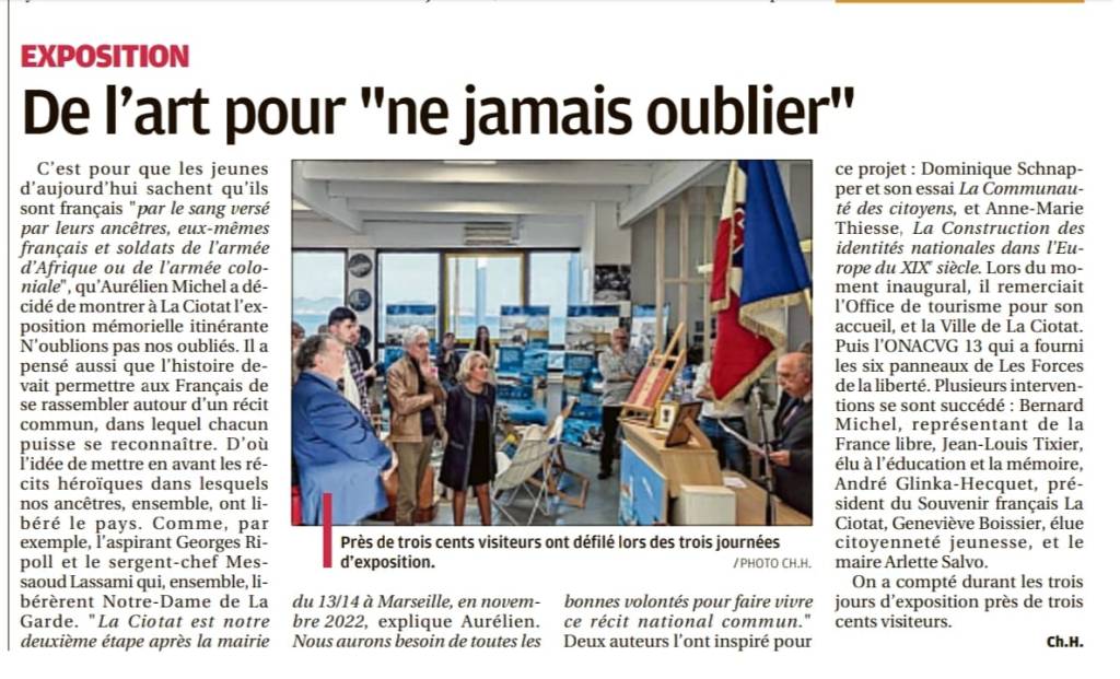 La Provence a consacrĂ© un article Ă l’exposition mĂ©morielle itinĂ©rante « N’oublions pas nos oubliĂ©s » organisĂ©e par l’association Ă La Ciotat. Près de trois cents visiteurs ont dĂ©filĂ© lors des trois journĂ©es d’exposition.
